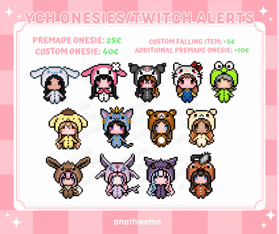 ❥ Have the onesie ears animated to wiggle: +5€❥ You can request a head icon version, version with 1-color background, Twitch emote sizes and 2 static versions for free