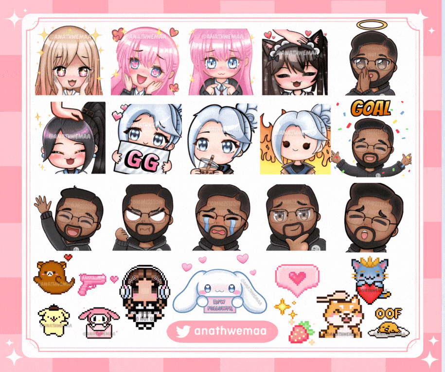 I'm Ana, an artist who specializes in digital illustrations and graphic design assets for Twitch (emotes, badges, overlays etc.), both pixel art and non-pixel.